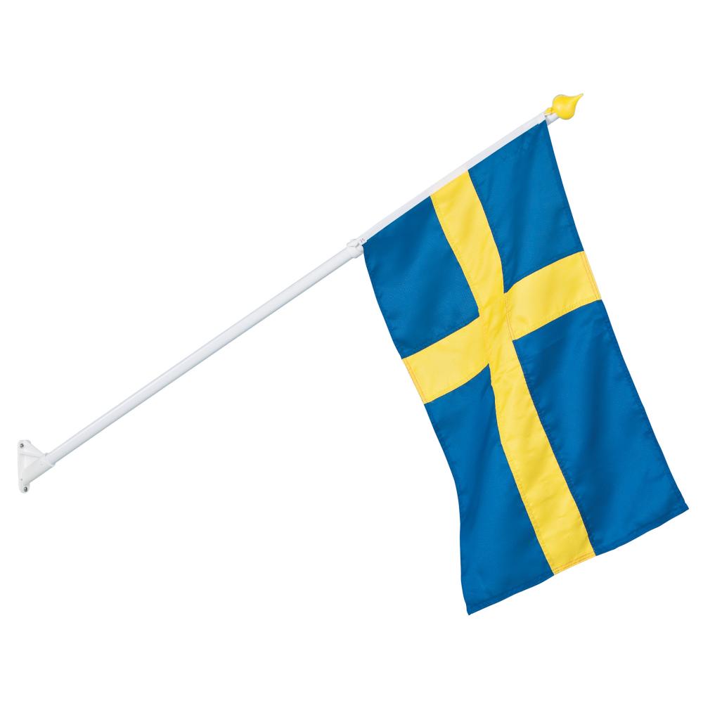 130 cm lång vitlackerad rostfri aluminiumstång Ø 22 mm, med svensk flagga (70 cm), fäste i compositmaterial, gul kula och flyttbar låsring av plast. 60° lutning.