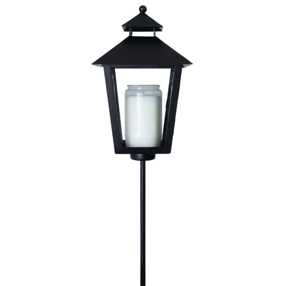 Gravlykta i svart metall med klart glas. Storlek 14x14x24 cm. 3-delat markspett 56 cm.