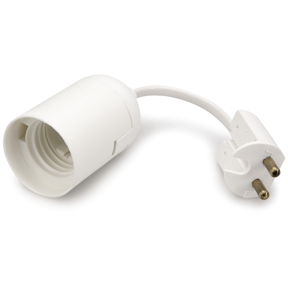 E27 vit slät lamphållare + lamppropp med vit SKX, dragavlastning vit + isolerinsats. Max 75W.