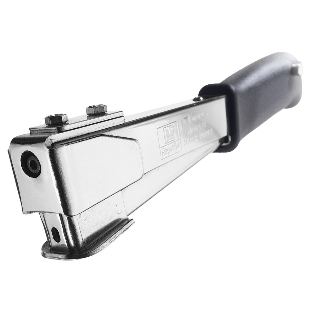 Kraftfull häfthammare för krävande häftning av isoleringsmaterial, underlagspapp, heltäckningsmattor mm. Stor slagyta förhindrar skador på häftmaterialet. För bredtrådsklammer 10-14 mm. Endast fem delar, hållbart och pålitligt. Stor slagyta.