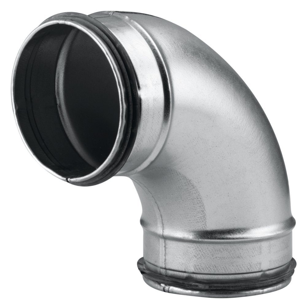Rörböj kort, extra kort bygglängd. Kanalsystem för cirkulär kanaldragning. Tillverkat av galvaniserad stålplåt.