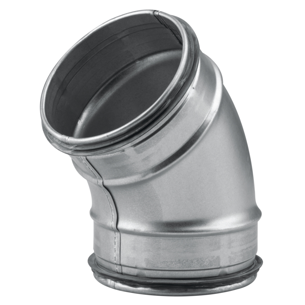Rörböj kort, extra kort bygglängd. Kanalsystem för cirkulär kanaldragning. Tillverkat av galvaniserad stålplåt.