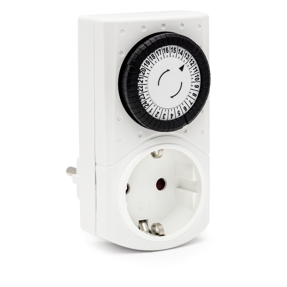 Mekanisk dygnstimer med 30 min intervall. Fasta segment som kan skjutas in eller dras ut för önskad kopplingstid. Knapp för fast tillslag eller timerdrift.
