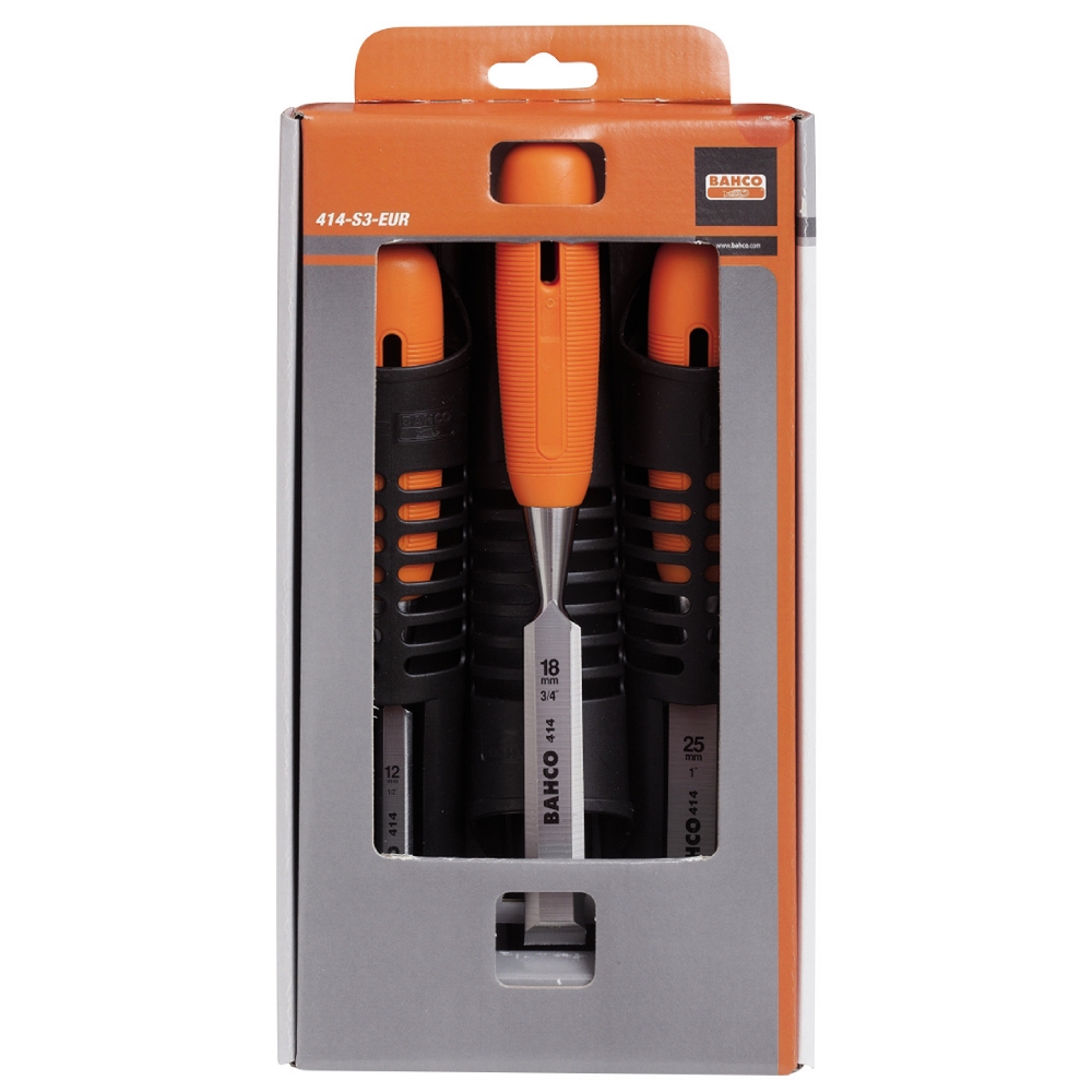 Sats med universalstämjärn. Enkomponentshandtag i polypropen. Precisionsslipat skäregg för bästa skärpa. Härdat för hög hållfasthet och lång livslängd. Skyddshölster. Innehåller: 12, 18 och 25 mm.