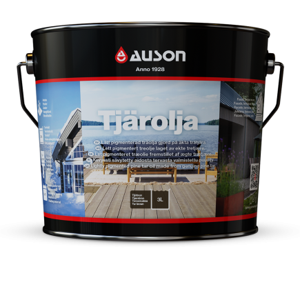 Auson Ofärgad Tjärolja framhäver träets naturliga kulör och ådring, samtidigt som den ger samma skyddande egenskaper och hållbarhet som de pigmenterade. Oljan är mörk vid målning men kulören försvinner efterhand som UV-strålarna bryter ner trätjäran på ytan som blir naturligt grå, och skyddet finns kvar i träet.