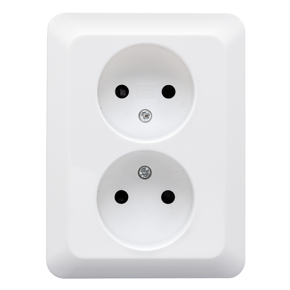 Petskyddade 250V 16A, 1 och 2-vägs jordade samt ojordade vägguttag för infällt montage. IP20.