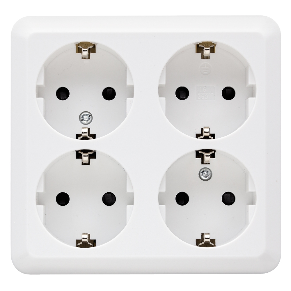 Petskyddade 230V 1,2 och 4-vägs jordade samt ojordade vägguttag för utanpåliggande montage. IP20.