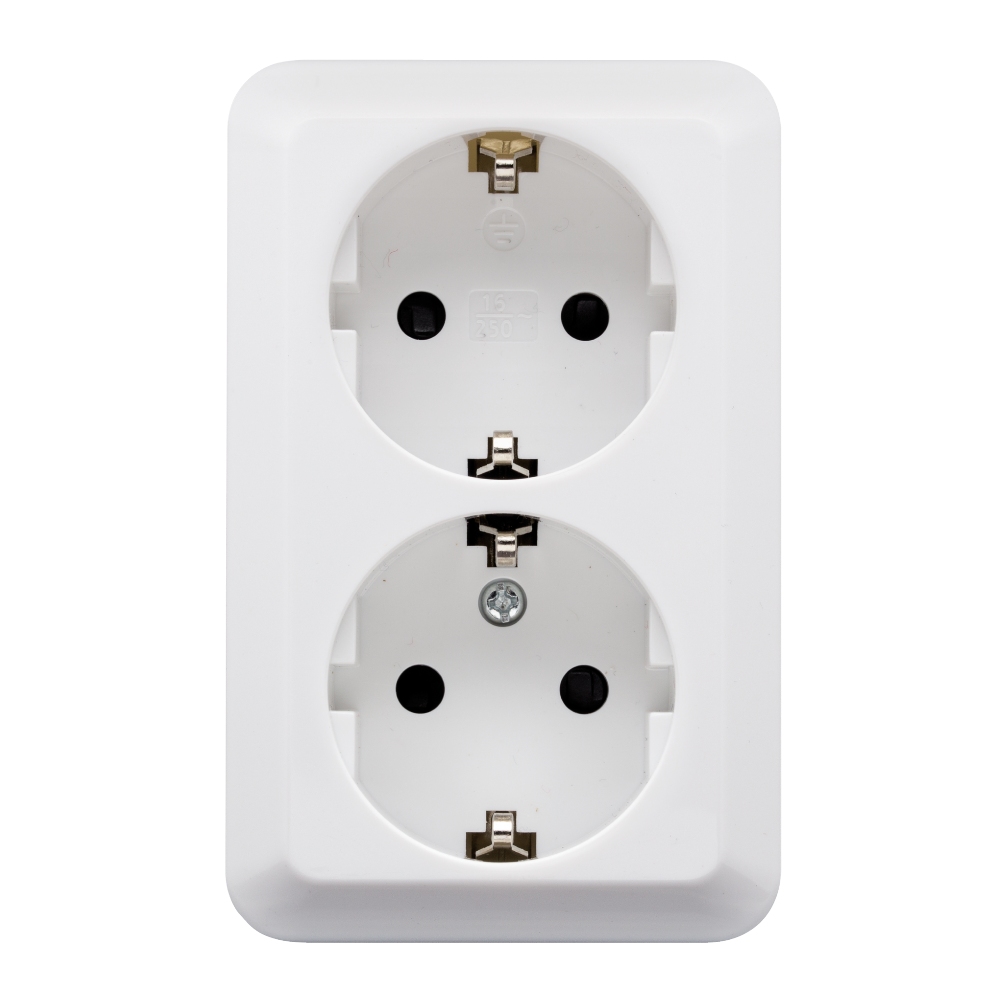 Petskyddade 230V 1,2 och 4-vägs jordade samt ojordade vägguttag för utanpåliggande montage. IP20.