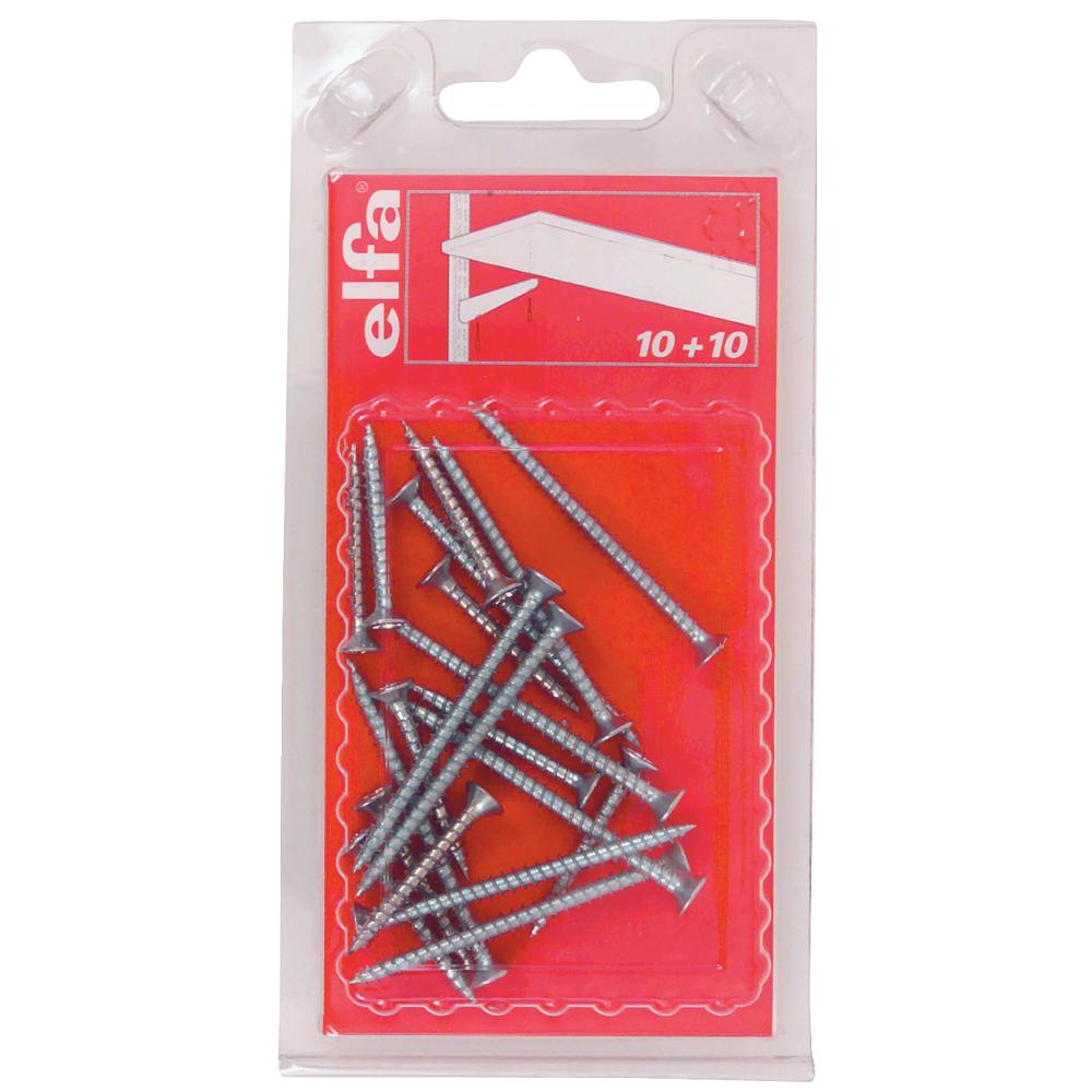 Genom att använda konsolskruv kan du försäkra dig om att dina melamin eller trähyllor kommer att stanna kvar på konsolen. Det är 20 skruvar i två längder per paket, en för det främre hålet och en för det bakre hålet på konsolen.