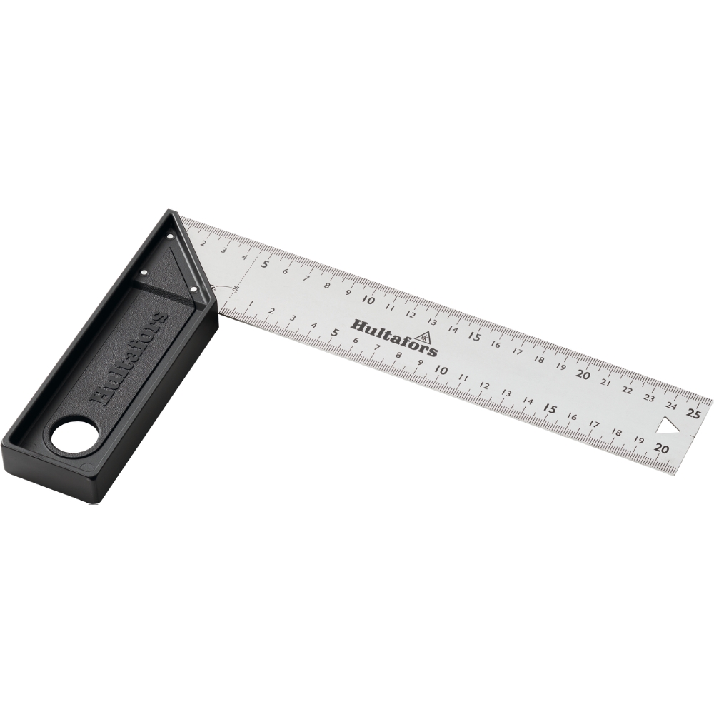 Vinkelhake utvecklad för att vara både lätt och hållbar. Utmärkt för dig som ofta bär med dig en vinkelhake i fickan. Bladet är 45 mm brett för att passa arbete med vanliga regelbredder. Specialnitar och ett blad av 1 mm tjockt, höghållfast rostfritt stål ger en väldigt tålig konstruktion som håller länge och tål tuffa arbetsmiljöer. Ett blad skuret med precisionslaser och nitar med väldigt små toleranser ger hög precision; vinkeltolerans ±0,06° (±1 mm/m).